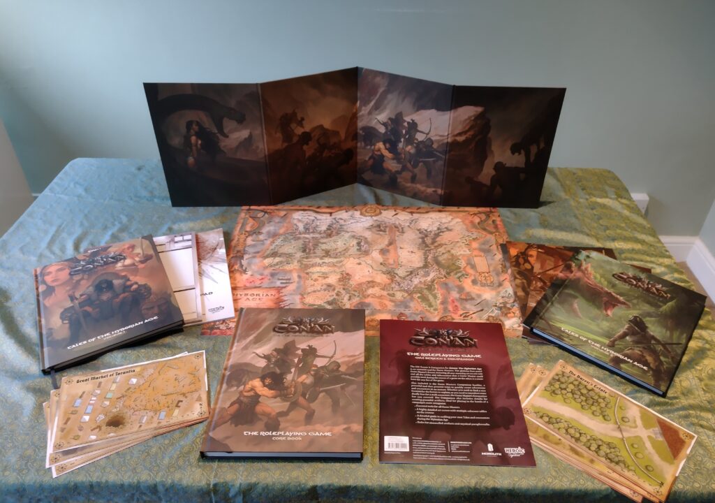This morning brings an epic care package: a complete Conan: The Hyborian Age bundle containing the core book, GM screen, two adventure books, glossy map pack, character pads, and a host of Conan accessories—by Crom!